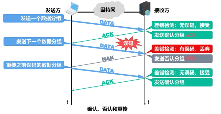发送方给接收方发送一个数据分组,接收方收到后对其进行差错检测,若没有检测出误码,则接受该数据分组并给发送方发送确认分组。简记为 ACK。发送方收到对所发送数据分组的确认分组号,才能发送下一个数据分组。假设这个数据分组在传输过程中出现了误码,接收方收到后对其进行差错检测,出了物码则丢弃该数据分组,并给发送方发送否认分组,简记为 NAK。