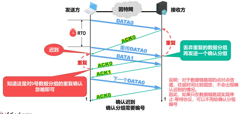 发送方发送 0 号数据分组,接收方正确接收后,给发送方发送确认分组,由于某种原因,该确认分组迟到了,这必然会导致发送方对 0 号数据分组的超时重传。在 0 号数据分组的重传过程中,发送方收到了迟到的确认分组,于是给接收方发送 1 号数据分组,接收方收到重传的 0 号数据分组,根据序号可知这是重复的数据分组将其丢弃,并针对 0 号数据分组再发送一个确认分组,这样发送方就会收到两个针对 0 号数据分组的确认。然而,发送方会将第二个针对 0 号数据分组的确认误认为是针对 1 号数据分组的确认。如果给确认分组也编上序号,发送方就可以知道这是对 0 号数据分组的重复确认,忽略即可。接收方正确收到 1 号数据分组后,给发送方发送针对 1 号数据分组的确认,分组确认号为1,发送方收到后给接收方发送下一个数据分组,序号为0。请同学们注意,这个 0 号数据分组与之前的 0 号数据分组不是同一个数据分组,接收方正确接收号,给发送方发送相应的确认分组确认号为0。