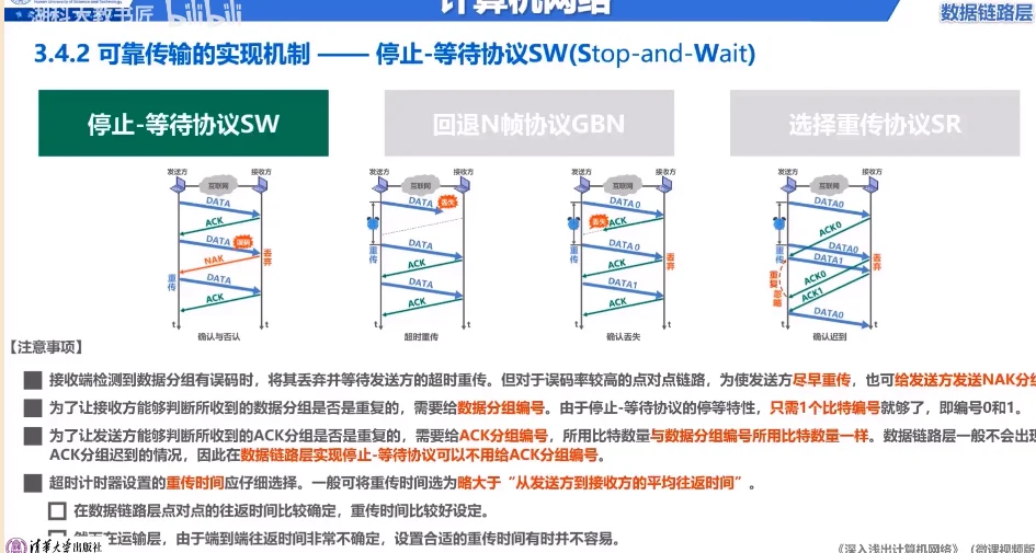 发送方收到对所发送数据分组的否认分组后,就知道了自己之前所发送的数据分组出现了物码而被接收方丢弃,于是立刻重传该数据分组。接收方收到后对其进行差错检测,若没有检测出误码,则接受该数据分组,并给发送方发送确认分组,**因此发送方每发送来一个数据分组后,并不能立刻将该数据分组从发送缓存中删除,因为之后有可能需要重传该数据分组。只有在收到针对该数据分组的确认分组后,才能将其从发送缓存中删除。
