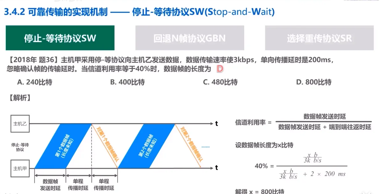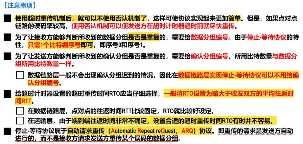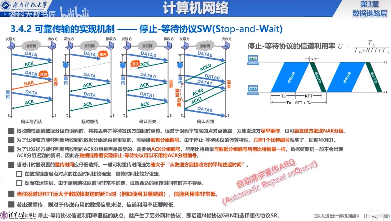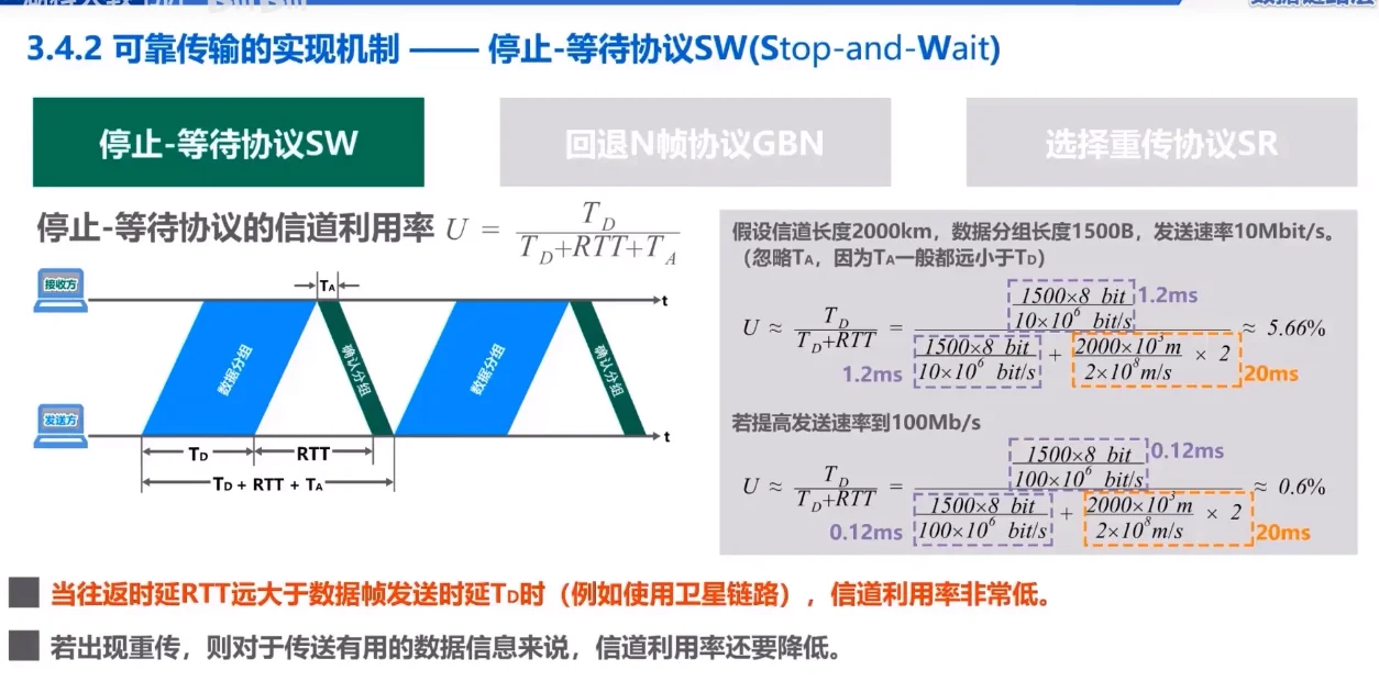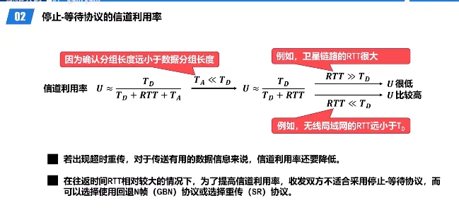 当信号在收发双方之间往返传播所耗费的时间 RTT 远大于数据分组的发送时间。 TD 时,例如地球同步卫星链路的 RTT 就很大。如果我们使用这样的链路而要发送的数据分组又很小且发送速率很大时,信道利用率就会很低。当 RTT 远小于数据分组的发送时间 TD 时,例如无线局域网的 RTT 一般远小于TD,此时的信道利用率还是比较高的。需要说明的是,上述推导未考虑出现超时重传的情况,若出现超时重传,对于传送有用的数据信息来说,信道利用率还要降低。