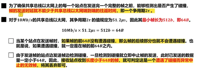 • 对于10Mb/s的共享总线以太网,其争用期的值规定为51.2μs,因此其最小帧长为512b,即64B。