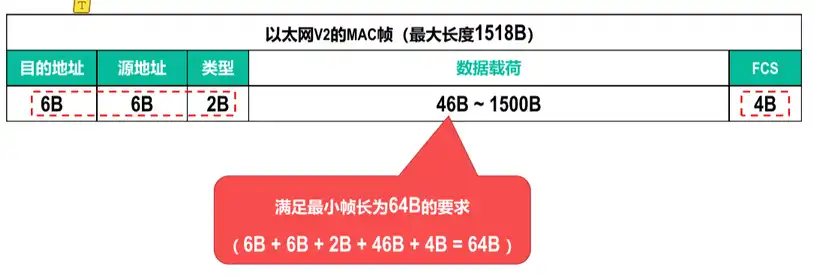 最小帧长 = 总线传播时延 * 数据传输速率 * 2(最短帧长为 64 B,未到则填充)