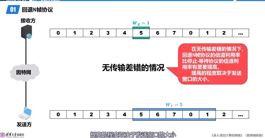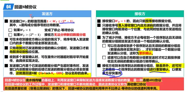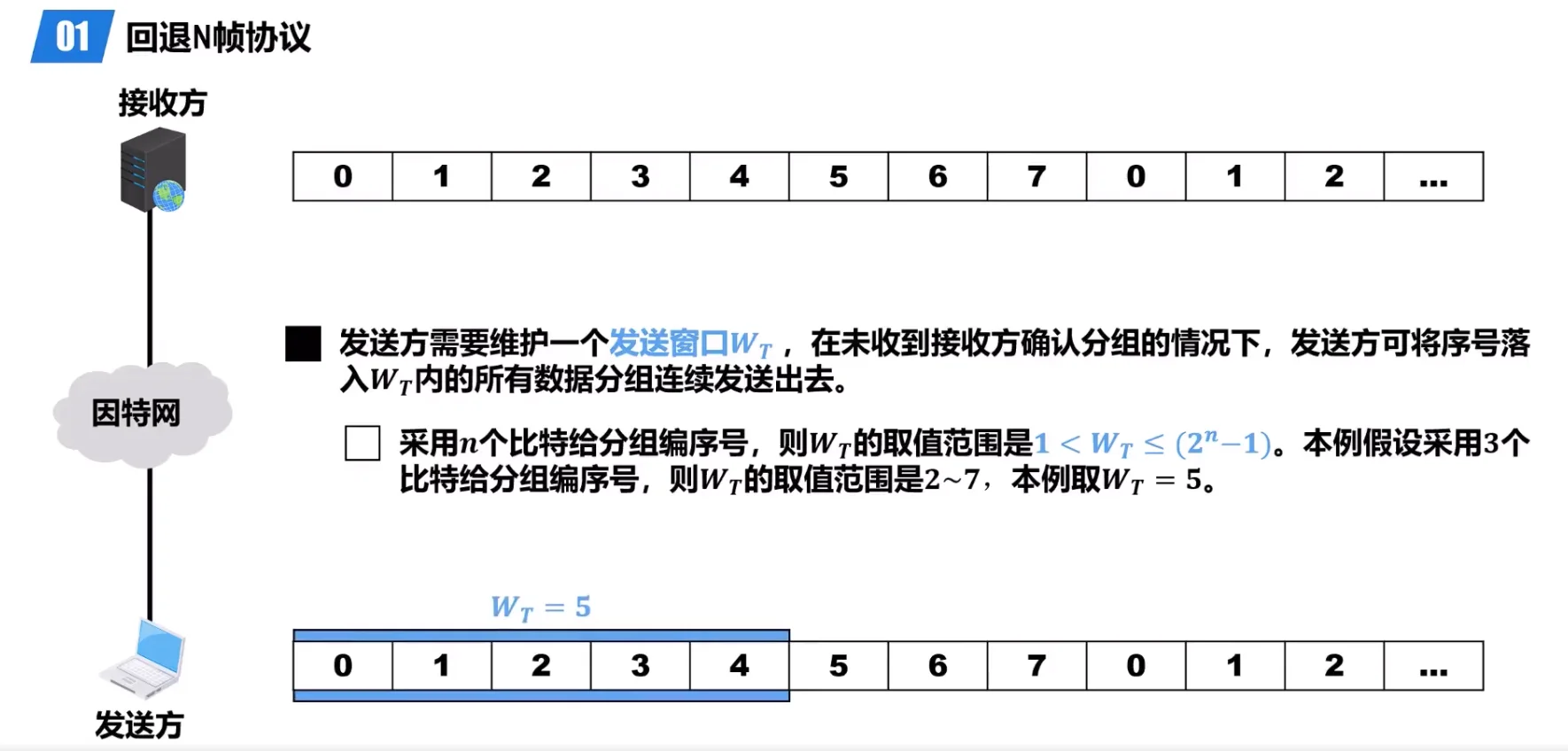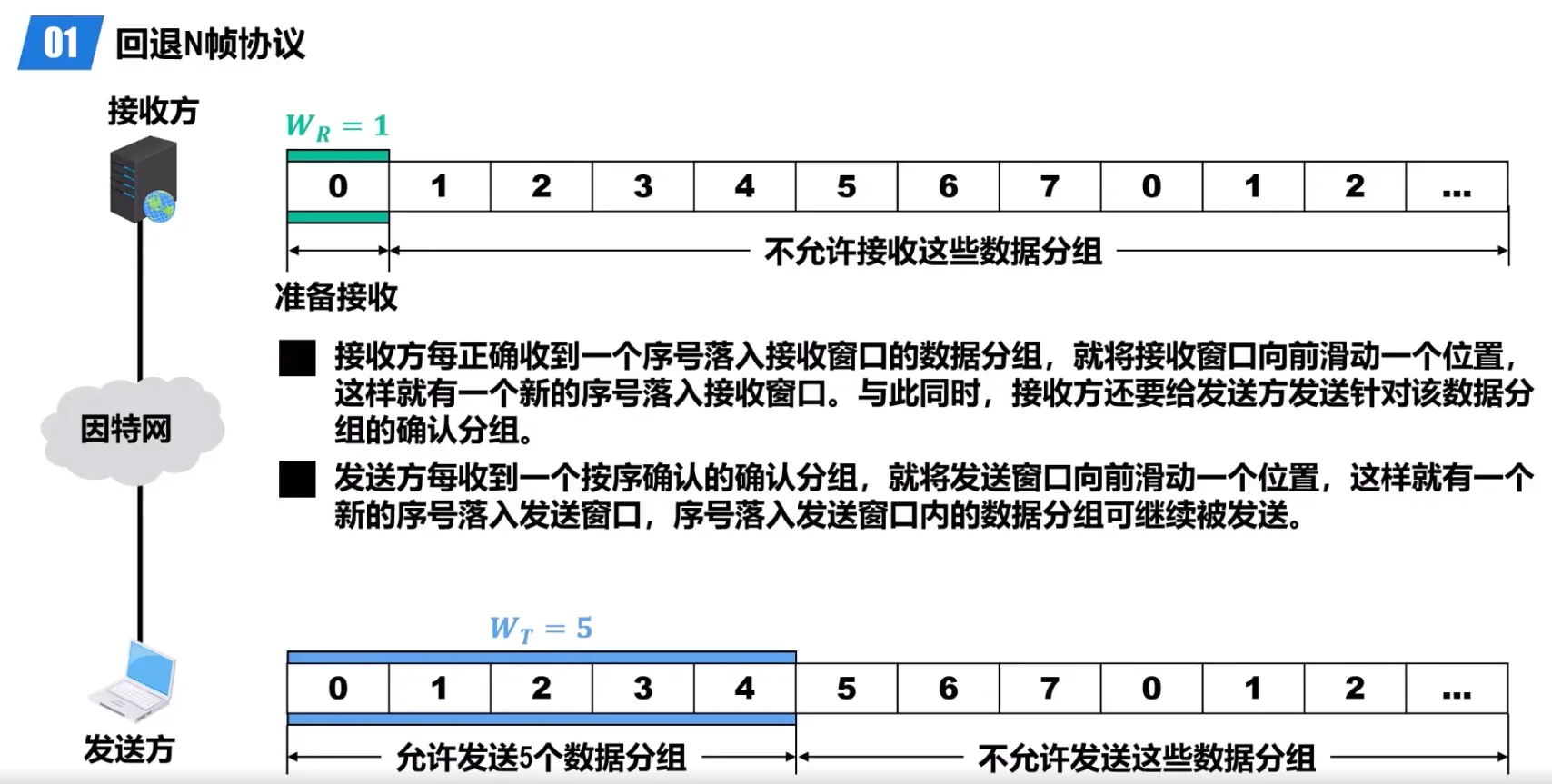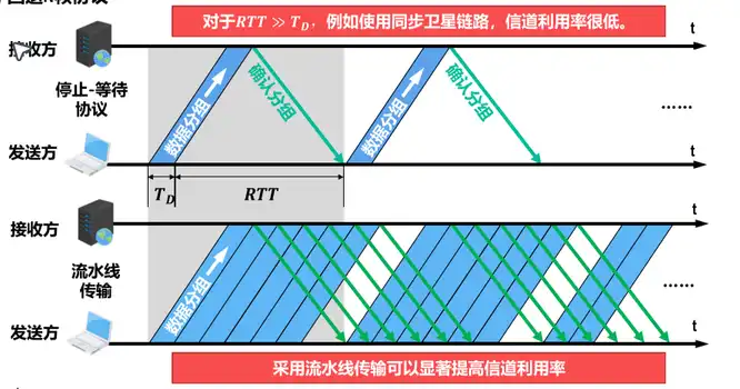 - 在使用流水线传输方式时,发送方不能无限制地连续发送数据分组,否则可能会导致网络中的路由器或接收方来不及处理这些数据分组,进而导致数据分组的丢失,这实际上是对网络资源的浪费。(限制发送数量)