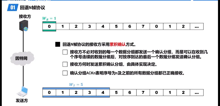 - 为了减少开销,接收方不必每收到一个按序到达且无误码的数据分组就给发送方发送一个相应的确认分组。