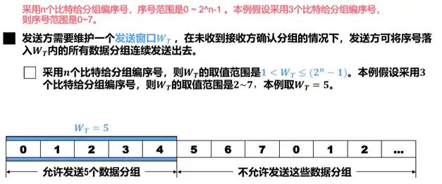 - 可在未收到接收方确认分组的情况下,将序号落入发送窗口内的多个数据分组全部发送出去。