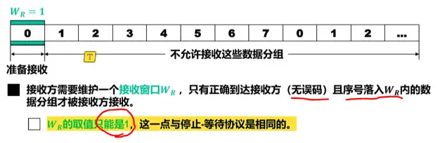,因此只能按序接收数据分组。 - 只接收序号落入接收窗口内且无误码的数据分组,并且将接收窗口向前滑动一个位置,与此同时给发送方发送相应的确认分组。