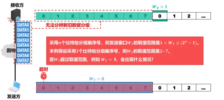 采用 n 个比特给分组编序号,范围是 02^n-1。本例假设采用 3 个比特给分组编序号,则序号范围是 07。当序号增加到 7 时,下一个序号又从 0 开始