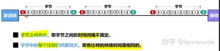 接收端:仅在每个字节的起始处对字节内的比特实现同步,所以要在每个字节前后加上起始位和结束位。