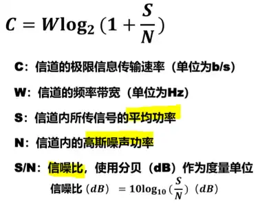 - 信道的频率带宽 W 或信道中的信噪比 S/N 越大,信道的极限信息传输速率 C 就越高.