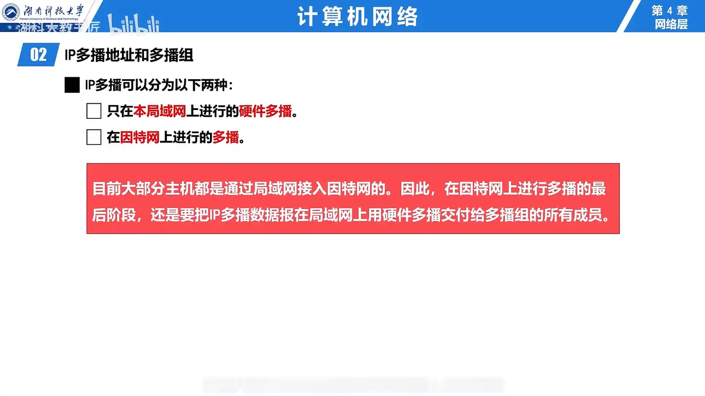 因此,在因特网上进行多播的最后阶段,还是要把IP多播数据报在局域网上用硬件多播交付给多播组的所有成员