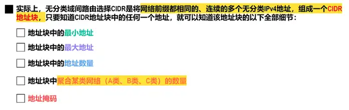 无分类编址方法使用的地址掩码与划分子网使用的子网掩码类似,由 32 比特构成。