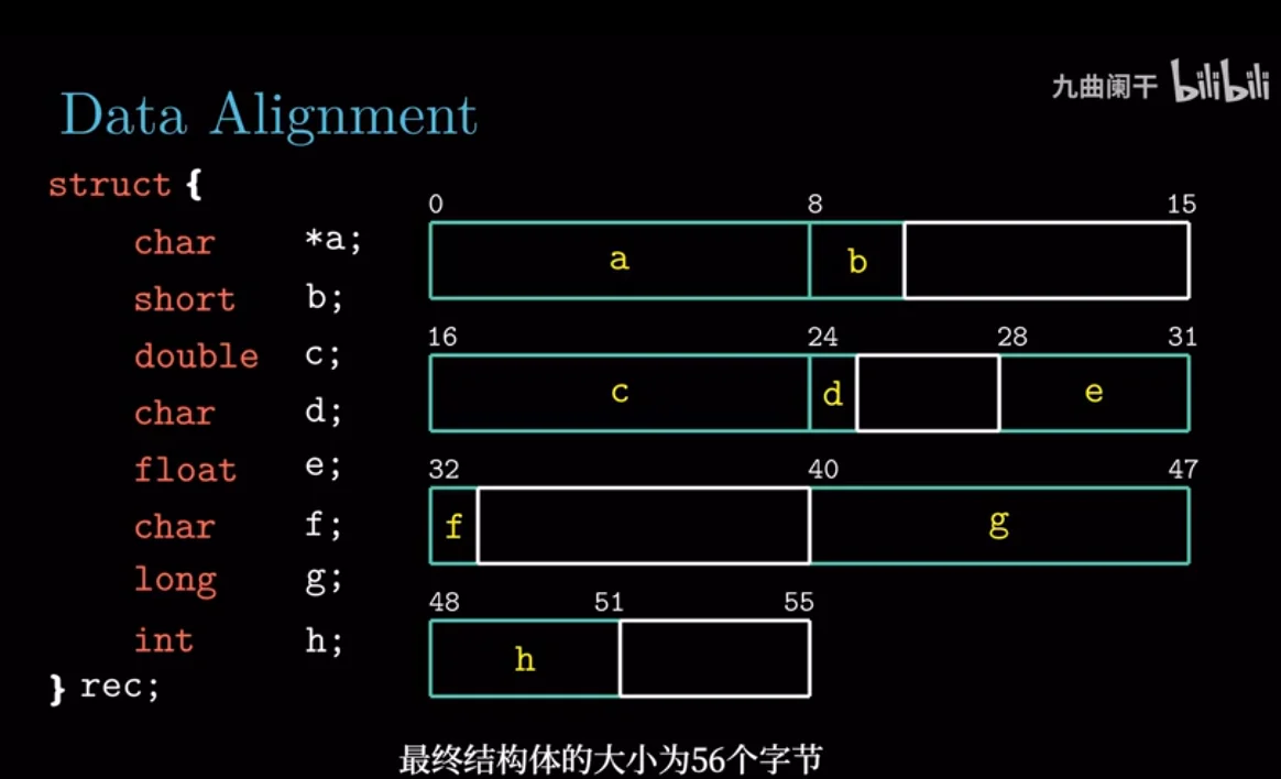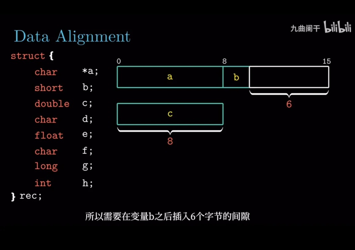 short 变量的起始地址就是上面的 a 的长度,short 的长度是 2,前面是 8 格,是 2 的倍数,满足对齐的要求,再往后,就是变量 c,c 的长度是 8,但是前面合计一共 10 不是 8 的倍数,所以要补齐 6,把前面补成 15