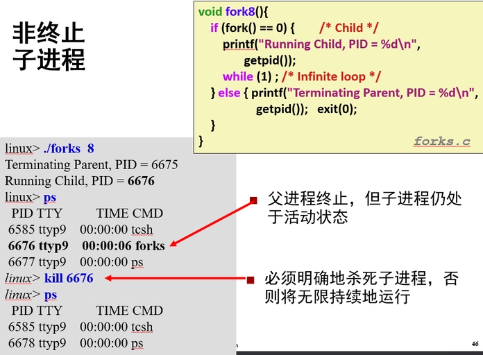 子进程中无限循环,上面的例子中是父进程中在无限循环