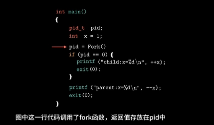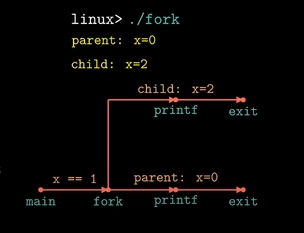 • 当 Fork 返回后,本地变量 x 在父进程和子进程中都是 1。然而父进程和子进程是独立的进程,他们都有自己的私有地址空间。后面父进程和子进程对变量 x 所做的任何改变都是独立的,不会反映到另一个进程的内存中。
