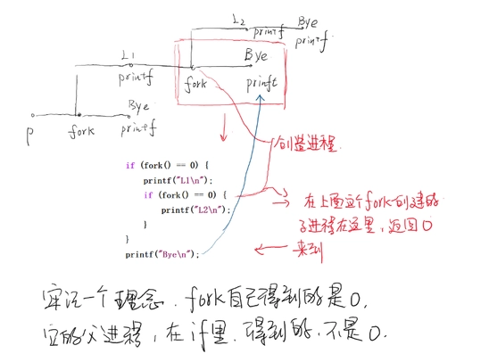 • 父进程中,fork 函数返回子进程的进程号,所以不为 0