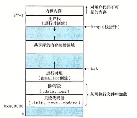 图中,我们把堆、数据和代码段画得彼此相邻,,并且把栈顶放在了最大的合法用户地址处(0x400000)