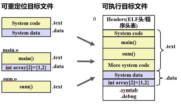 例如,来自所有输入模块的. data 节被全部合并成一个节,这个节成为输出的可执行目标文件的. data 节