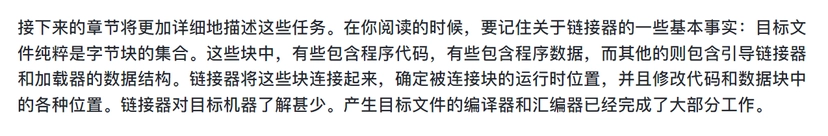 接下来的章节将更加详细地描述这些任务。在你阅读的时候,要记住关于链接器的一些基本事实:目标文件纯粹是字节块的集合。这些块中,有些包含程序代码,有些包含程序数据,而其他的则包含引导链接器和加载器的数据结构。链接器将这些块连接起来,确定被连接块的运行时位置,并且修改代码和数据块中的各种位置。链接器对目标机器了解甚少。产生目标文件的编译器和汇编器已经完成了大部分工作。