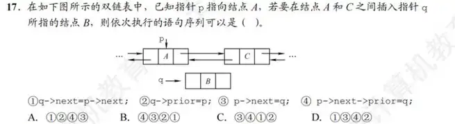 在如下图所示的双链表中,已知指针 p 指向结点 A ,若要在结点 AC 之间插入 指针 q 所指的结点 B ,则依次执行的语句序列可以是 ( ).