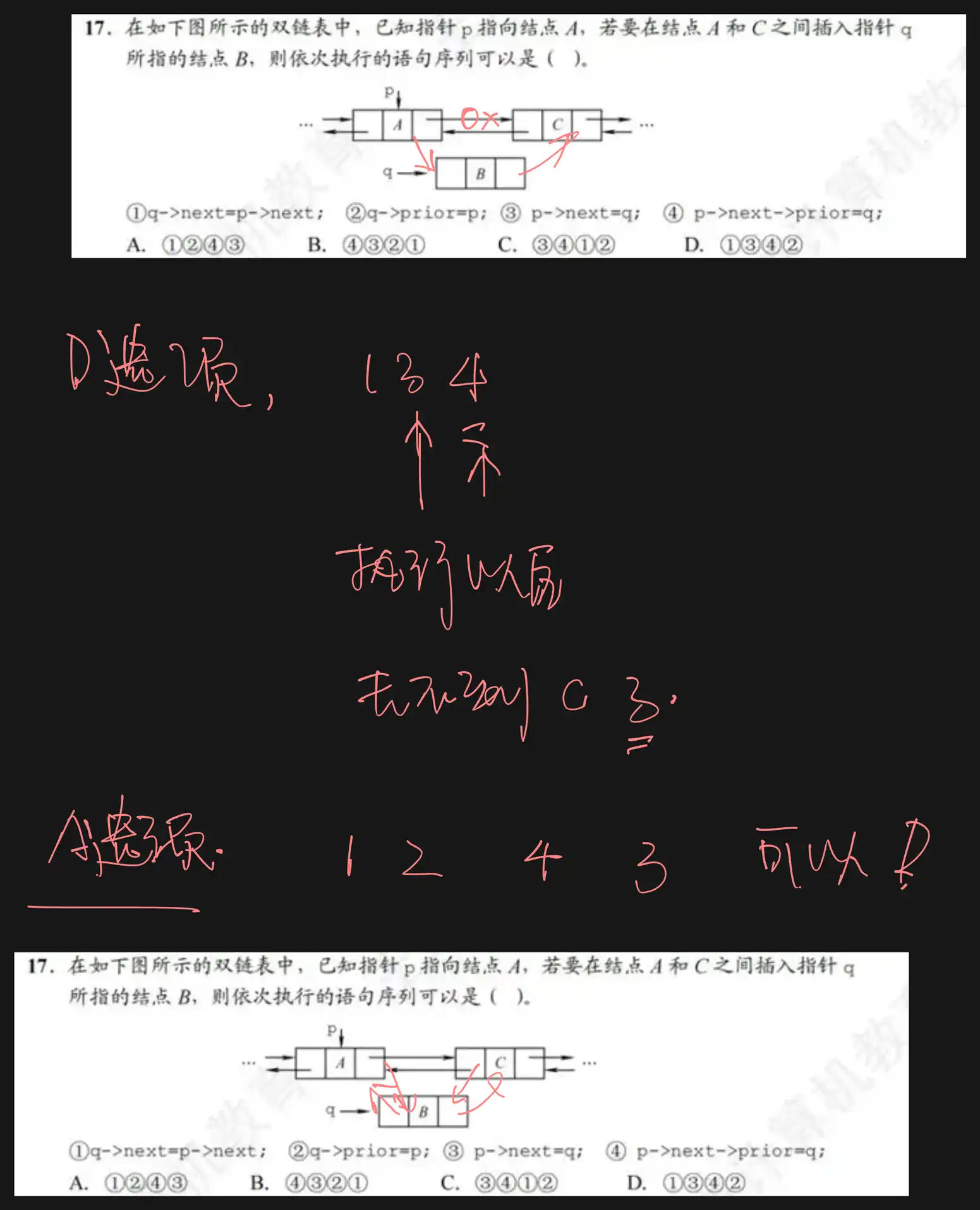 结点 分别由指针 pq 指示,但结点 仅能由 p->next 间接指示,因此在改变 p->nextp->next->prior 之前,必须先将 q->next 指向结点 C ,即①要在③和④前面,且④要在③ 前面 (因为若先执行③, 则④相当于 q->prior 指向其自身, 显然矛盾)。