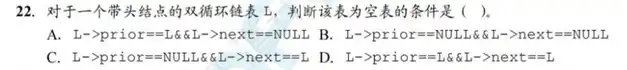Q:对于一个带头结点的双循环链表 L ,判断该表为空表的条件是 ( )