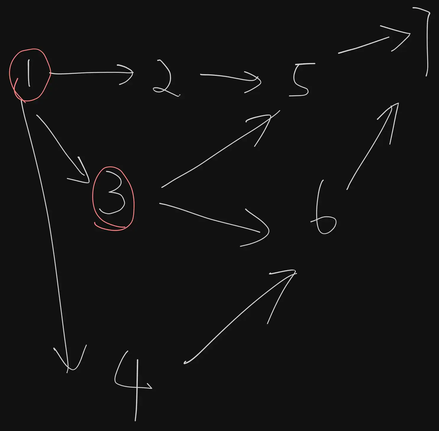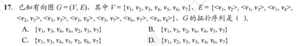 拓扑序列的过程: 找到入度为 0 的顶点, 删除该顶点及其所有出边, 并将顶点加入拓扑序列,重复直至所有顶点都加入拓扑序列。选择入度为 0 的顶点