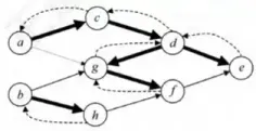 对有向无环图利用深度优先搜索进行拓扑排序的例子如下: 如下图所示, 退出 DFS 栈的顺序为 efgdcahb, 此图的一个拓扑序列为 bhacdgfe。该方法的每一步均是先输出当前无后继的结点,即对每个结点