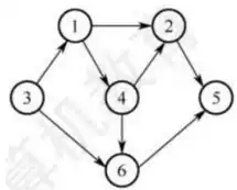 按照拓扑排序的算法, 每次都选择入度为 0 的结点从图中删除, 此图中一开始只有结点 3 的入度为 0 ; 删除结点 3 后, 只有结点 1 的入度为 0 ; 删除结点 1 后, 只有结点 4 的入度为 0 ; 删除结点 4 后, 结点 2 和结点 6 的入度都为 0 , 此时选择删除不同的结点, 会得出不同的拓扑序列,分别处理完毕后可知可能的拓扑序列为 ,选