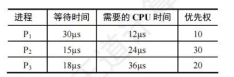 时刻就绪队列中有 3 个进程 , 其在就绪队列中的等待时间、需要的 CPU 时间和优先权如下表所示。