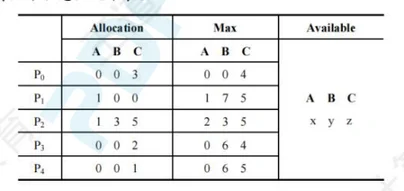 假设具有 5 个进程的进程集合 ,系统中有三类资源 ,假设在某时刻有如下状态, 见下表。