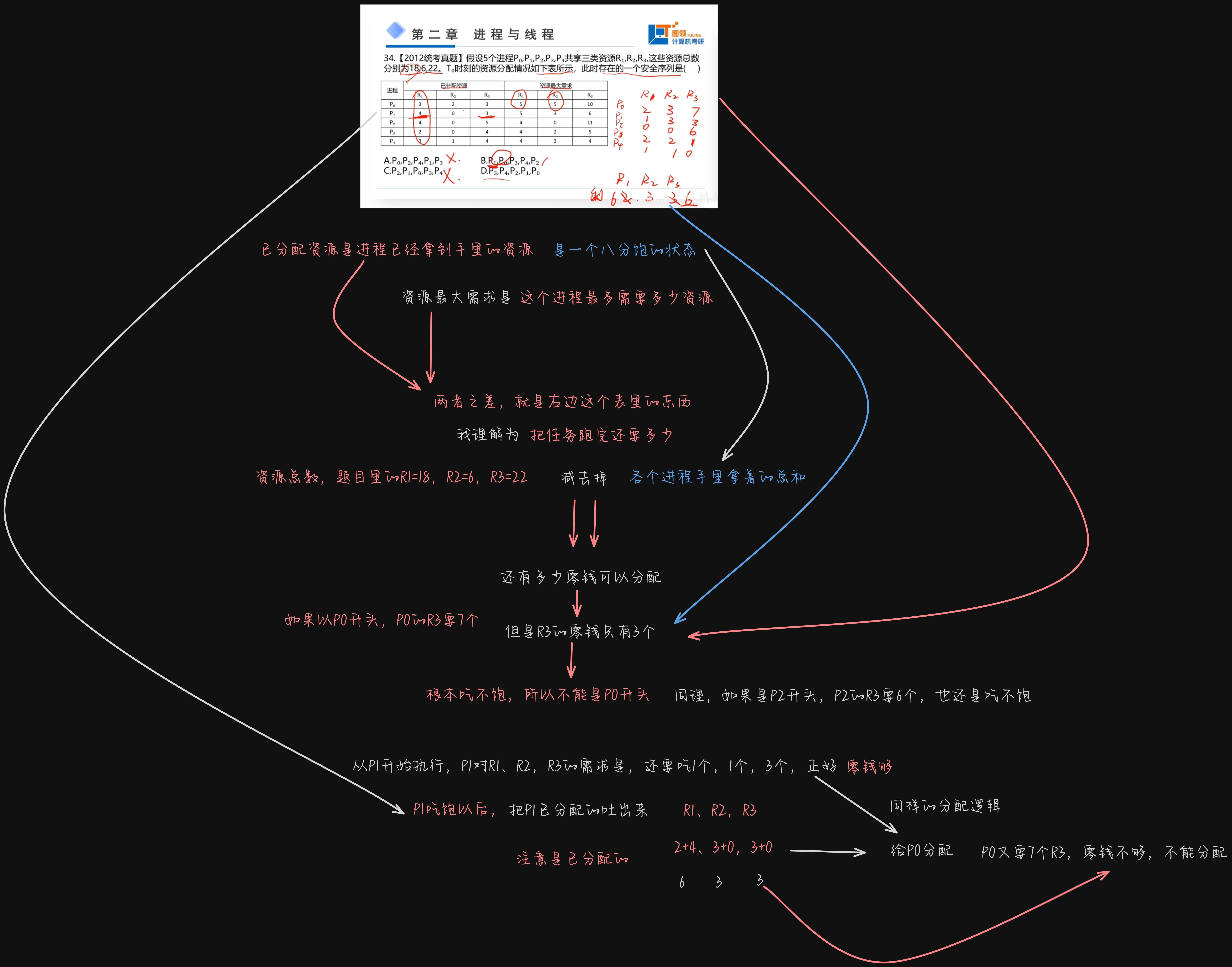 尝试给 分配资源时, 完成后 Available 将变为 ,无法满足 的需求,排除选项 。尝试给 分配资源时, 完成后 Available 将变为 ,该向量能满足其他所有进程的需求。