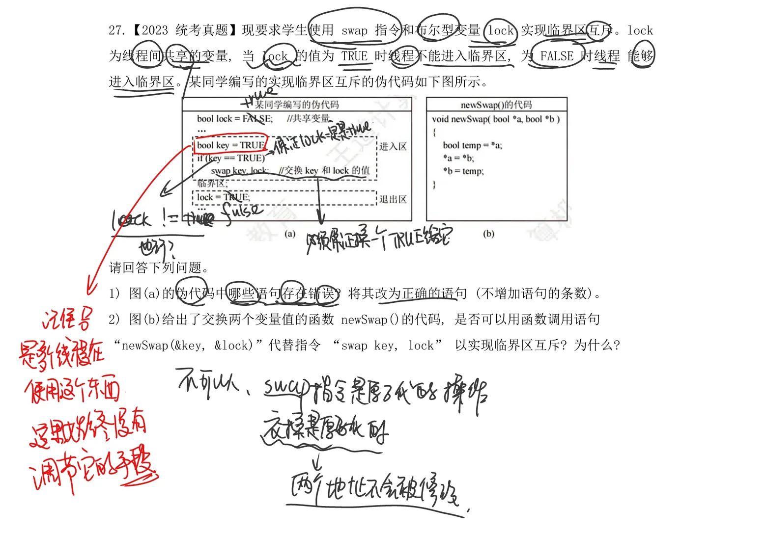 - if 语句无法实现对临界区的互斥访问, 因为 if 语句执行后, 不论结果如何, 线程都能访问临界区。本题使用 swap 指令和 lock 变量来实现对临界区的互斥访问, 当线程不能进入临界区时, 本身并不会主动放弃 CPU, 因此需要要让线程在进入区中循环检查 lock 值, 可以使用 while 循环, 当 lock 值为 TRUE 时, 线程一直执行 while 循环的内容, 直到 lock 值被修改为 FALSE 时, 线程才能进入临界区, 因此将进入区中的语句 “if (key = TRUE) swap key, lock” 修改为 “while (key = TRUE) swap key, lock”。在退出区中,代表该线程对临界资源的访问已经结束, 此时需要将 lock 值设为 FALSE, 代表其他线程可以访问临界区, 因此将退出区中的语句 “lock = TRUE” 修改为 “lock = FALSE”。