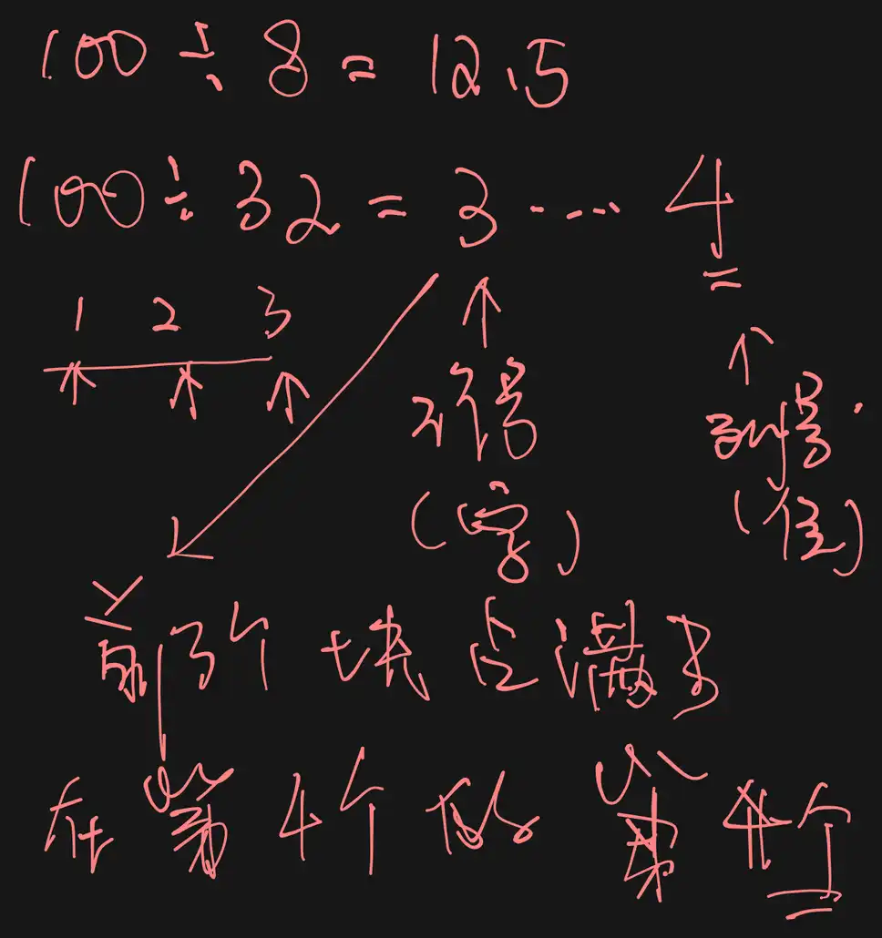 首先求出块号 100 所在的行号, 在行号 1 中, 在行号 2 中, 在行号 3 中, 在行号 4 中,所以块号 100 在行号 4 中; 然后求出块号 100 在行号 4 中的哪列,行号 4 的第 1 列是块号 97, 以此类推, 块号 100 在行号 4 中的第 4 列。另解, 行号 row 和列号 col 分别为