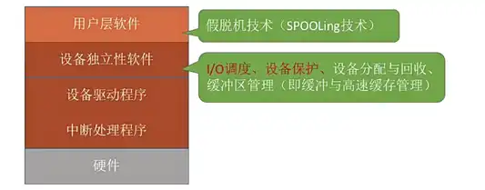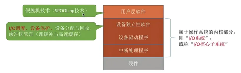 A: I/O 调度、设备保护、设备分配与回收、缓冲区管理(即缓冲与高速缓存)。