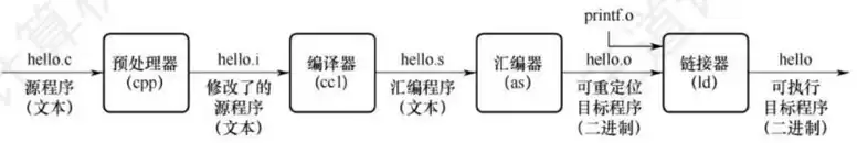 4. 链接阶段:链接器将多个可重定位目标文件和标准库函数合并成一个可执行目标文件。