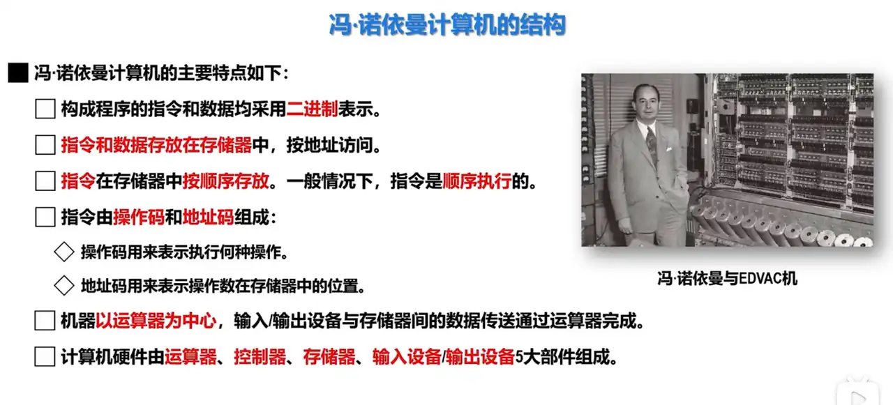 A:冯·诺依曼结构计算机的功能部件包括输入设备、输出设备、存储器、运算器和控制器, 程序的功能都通过中央处理器 (运算器和控制器) 执行指令, A 正确。