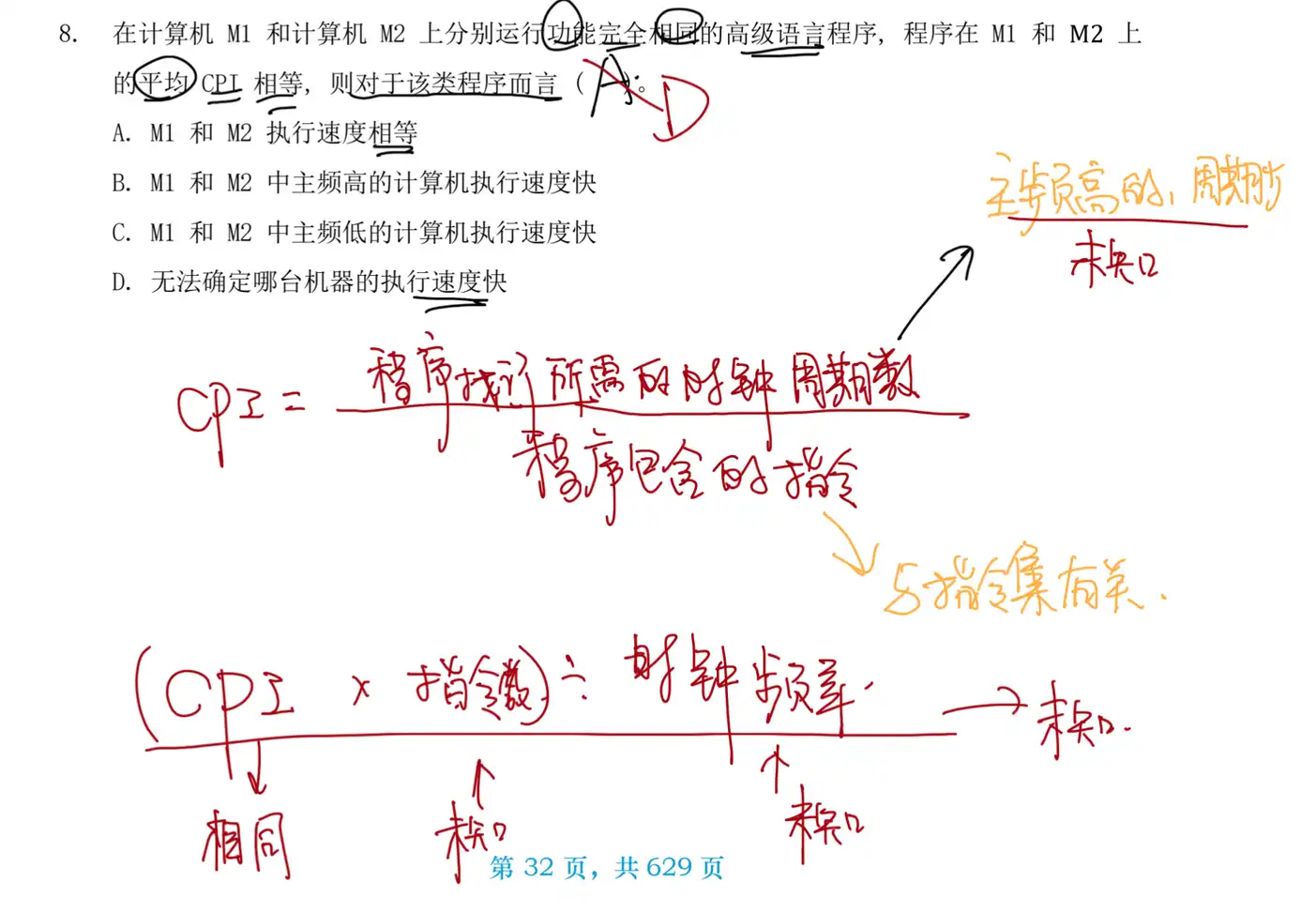 Q:在计算机 M1 和计算机 M2 上分别运行功能完全相同的高级语言程序, 程序在 M1 和 M2 上的平均 CPI 相等, 则对于该类程序而言 ( )。