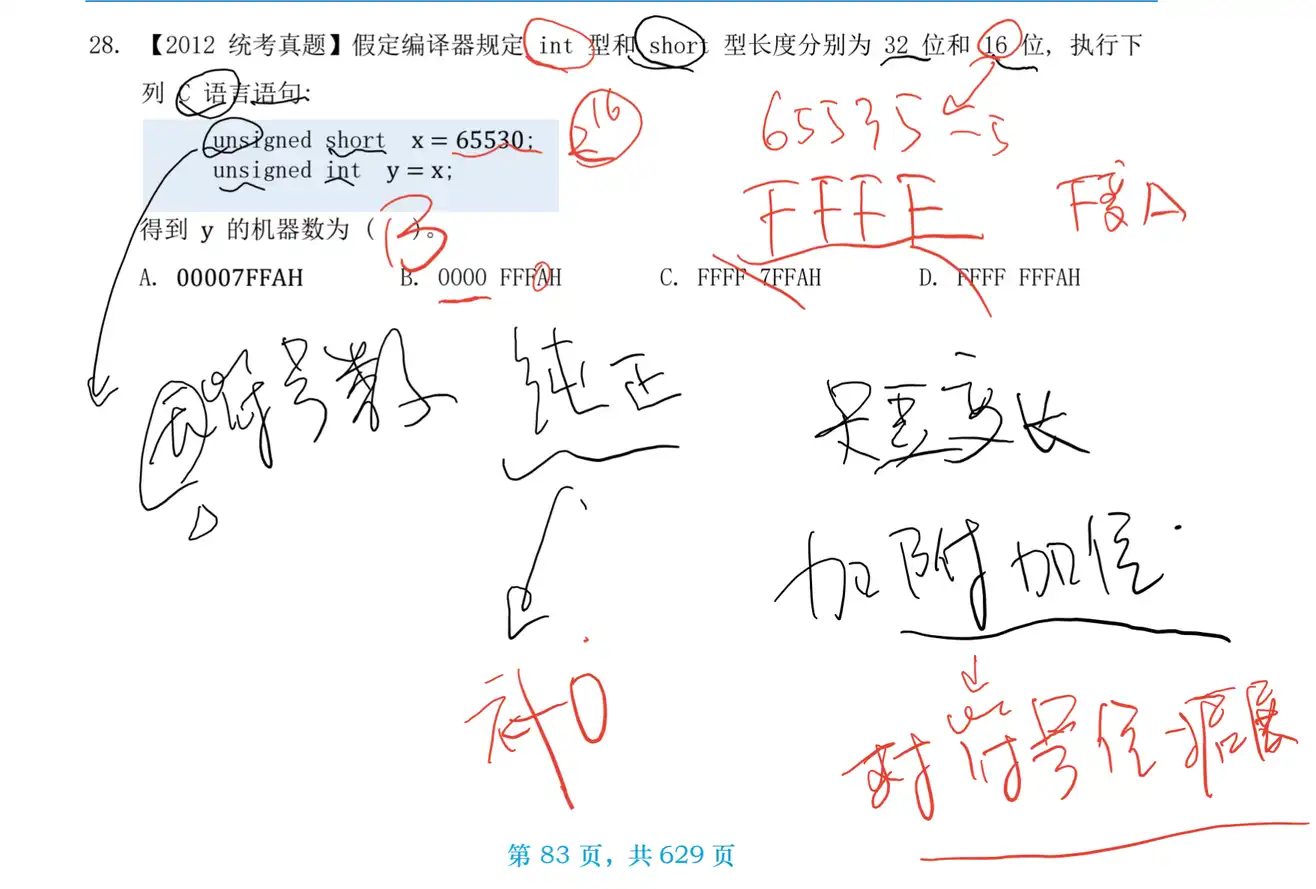 Q:【2012 统考真题】假定编译器规定 int 型和 short 型长度分别为 32 位和 16 位, 执行下列