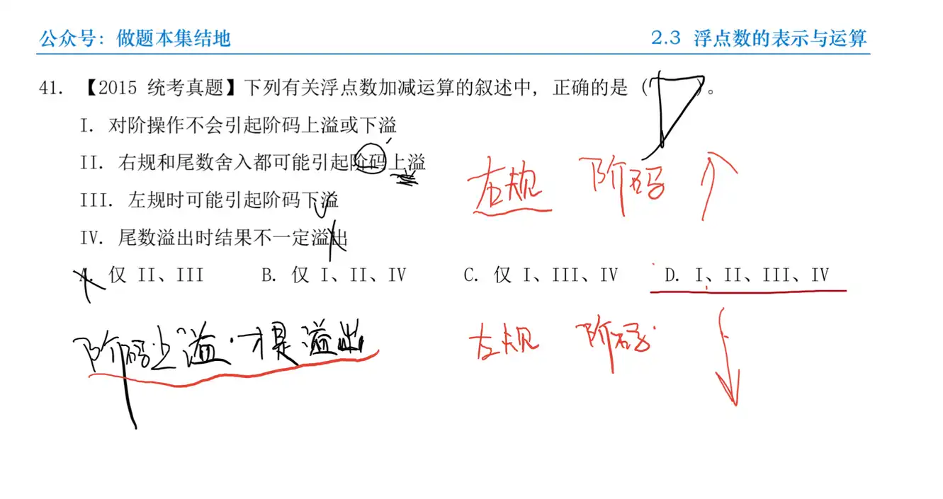 A:对阶是较小的阶码向较大的阶码对齐, 所以对阶后的阶码是当前那个较大的阶码而不会导致阶码溢出, I 正确。