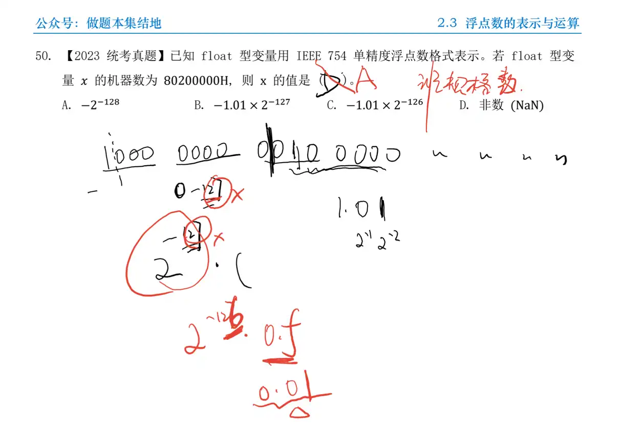 Q:【2023】 统考真题已知 float 型变量用 IEEE 754 单精度浮点数格式表示。若 float 型变量 的机器数为 ,则 的值是 ( ) 。