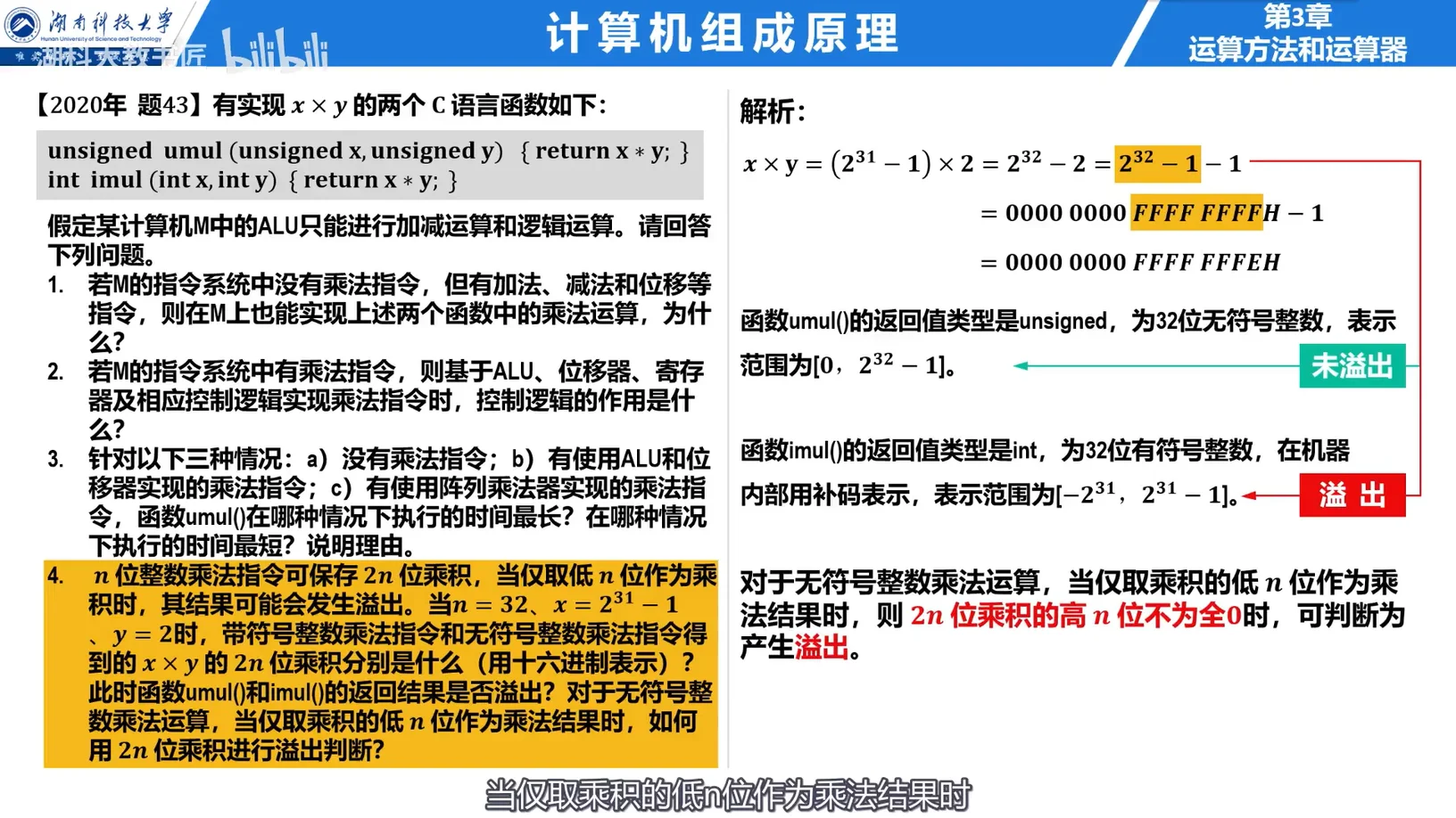位整数乘法指令可保存 位乘积,当只取低 位作为乘积时,其结果可能会发生溢出。当 时,有符号整数乘法指令和无符号整数乘法指令得到的 的 位乘积分别是什么 (用十六进制表示)? 此时函数 umul () 和 imul () 的返回结果是否溢出?对于无符号整数乘法运算,当仅取乘积的低 位作为乘法结果时,如何用 位乘积进行溢出判断?