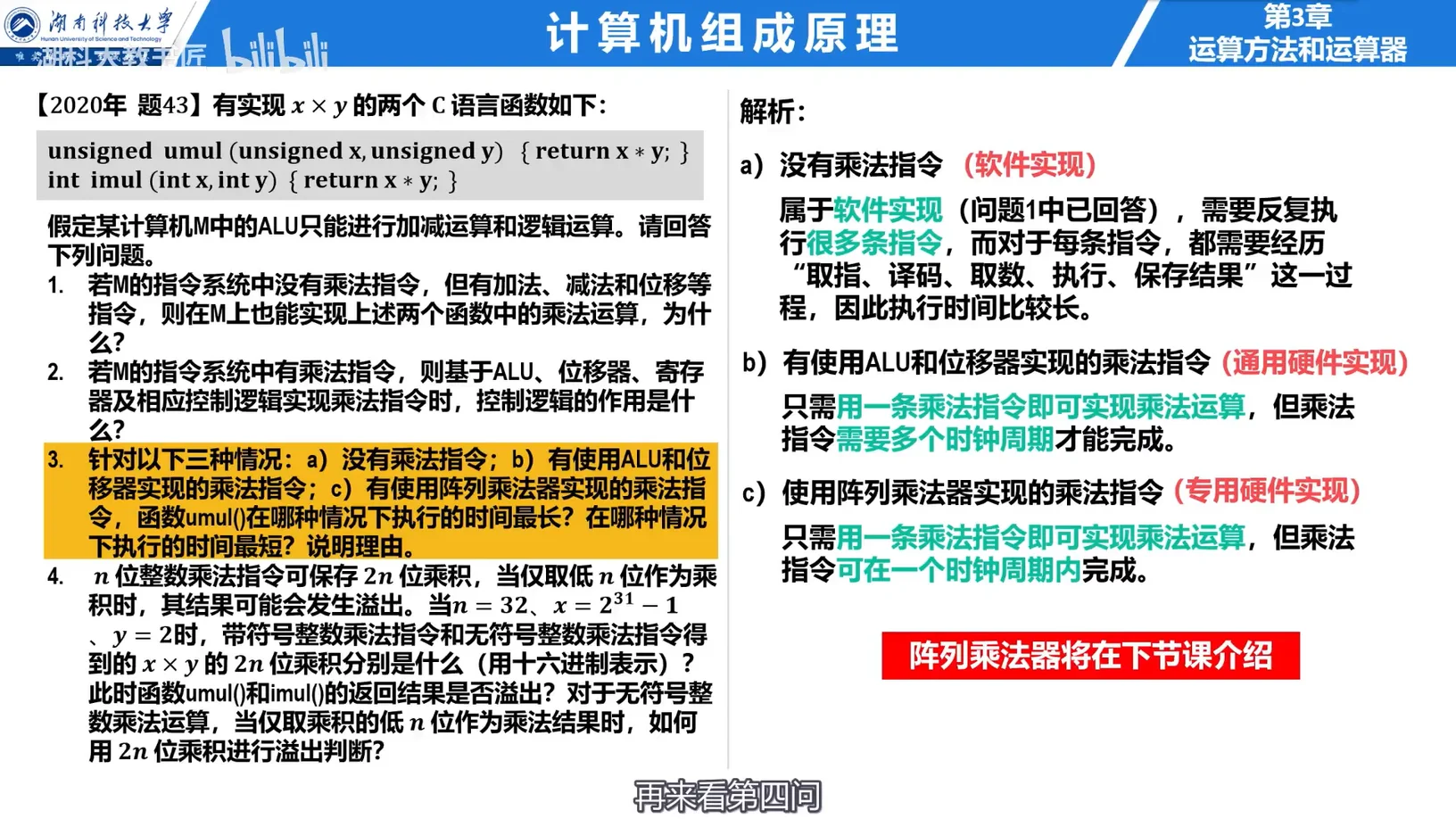 - 针对以下三种情况: a) 没有乘法指令; b) 有使用 ALU 和位移器实现的乘法指令; c) 有使用阵列乘法器实现的乘法指令, 函数 umul () 在哪种情况下执行的时间最长? 在哪种情况下执行的时间最短?说明理由。