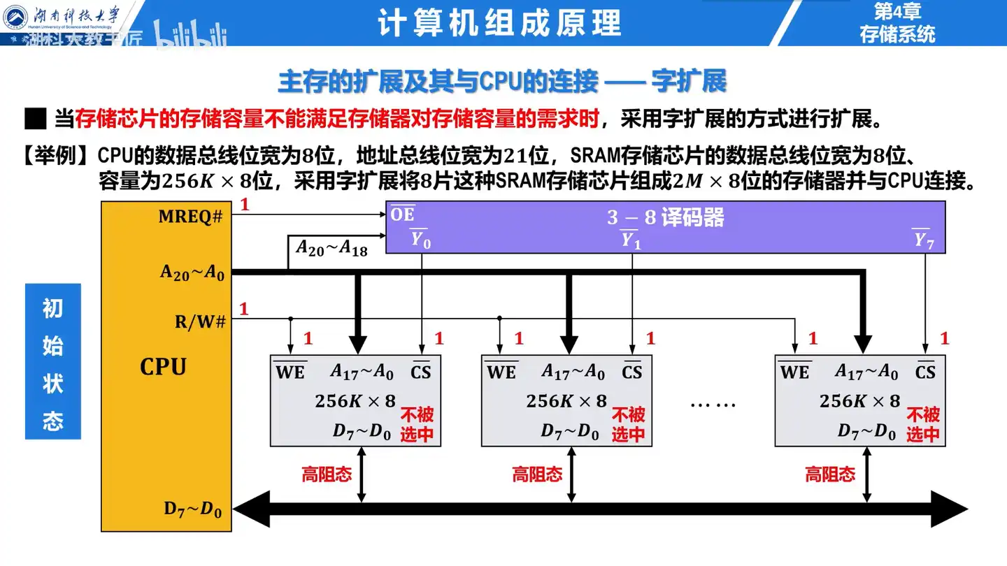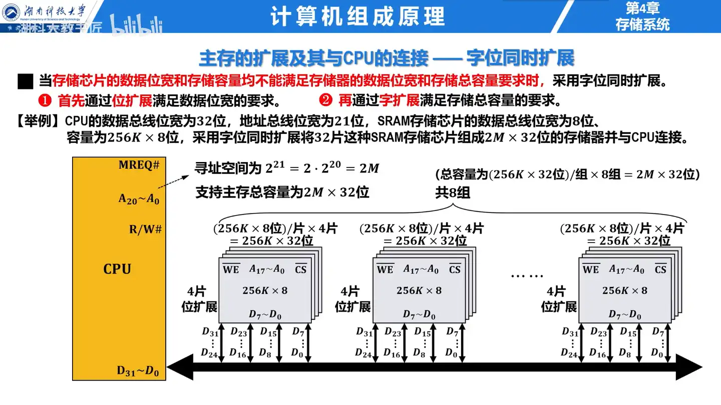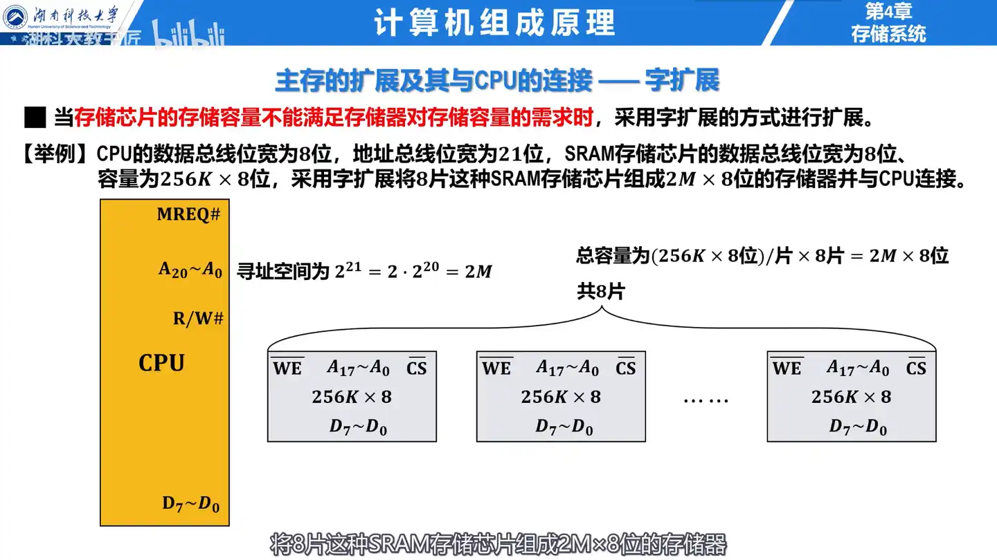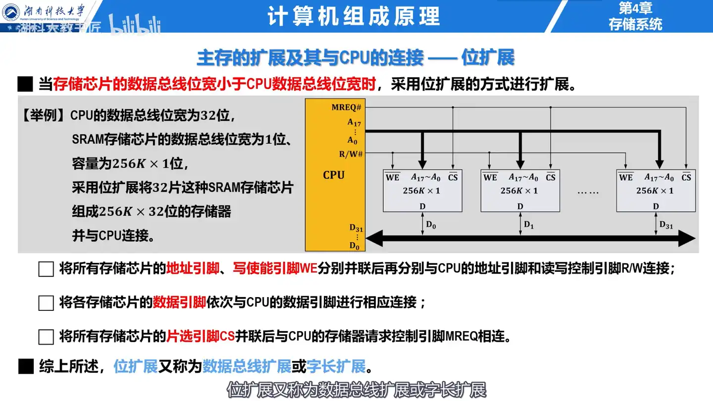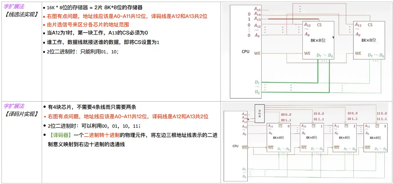 - 当 CPU 的数据线数与存储芯片的数据线数不相等时,必须对存储芯片扩位,使其数据位数与 CPU 的数据线数相等。