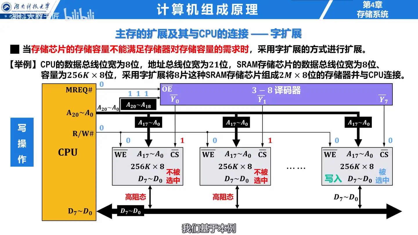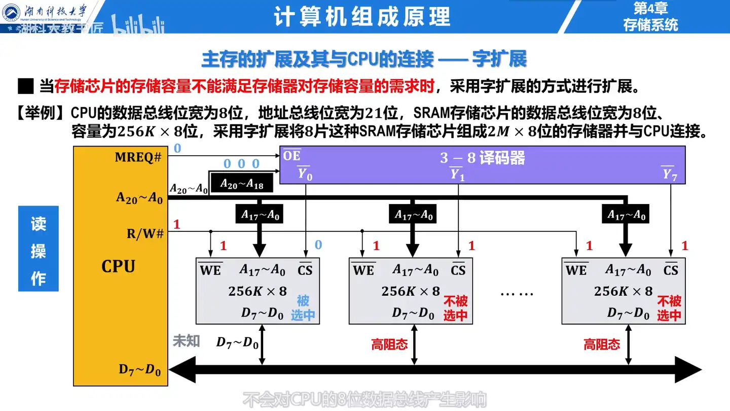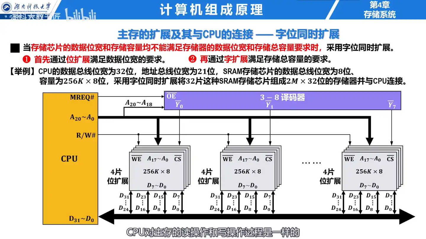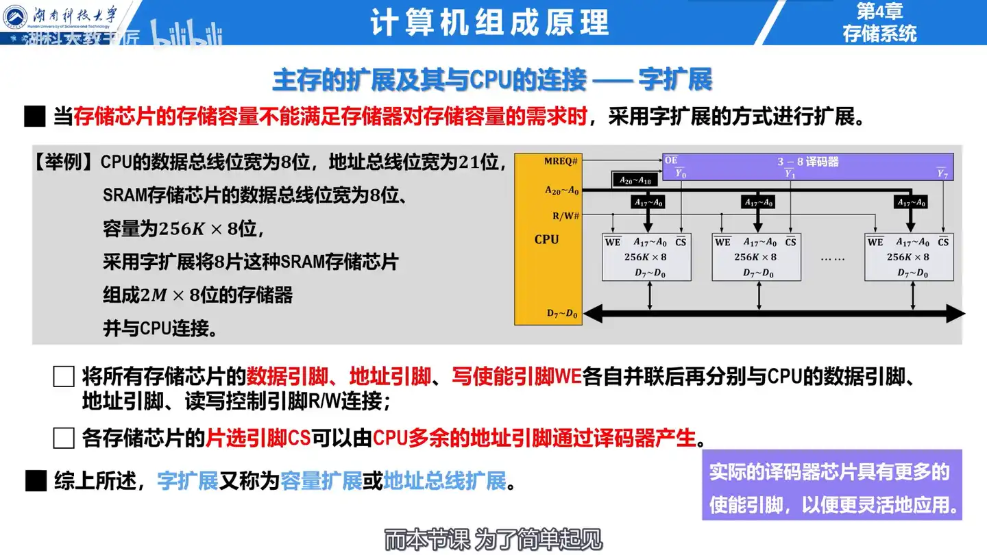 - 当 CPU 的数据线数与存储芯片的数据线数不相等时,必须对存储芯片扩位,使其数据位数与 CPU 的数据线数相等。