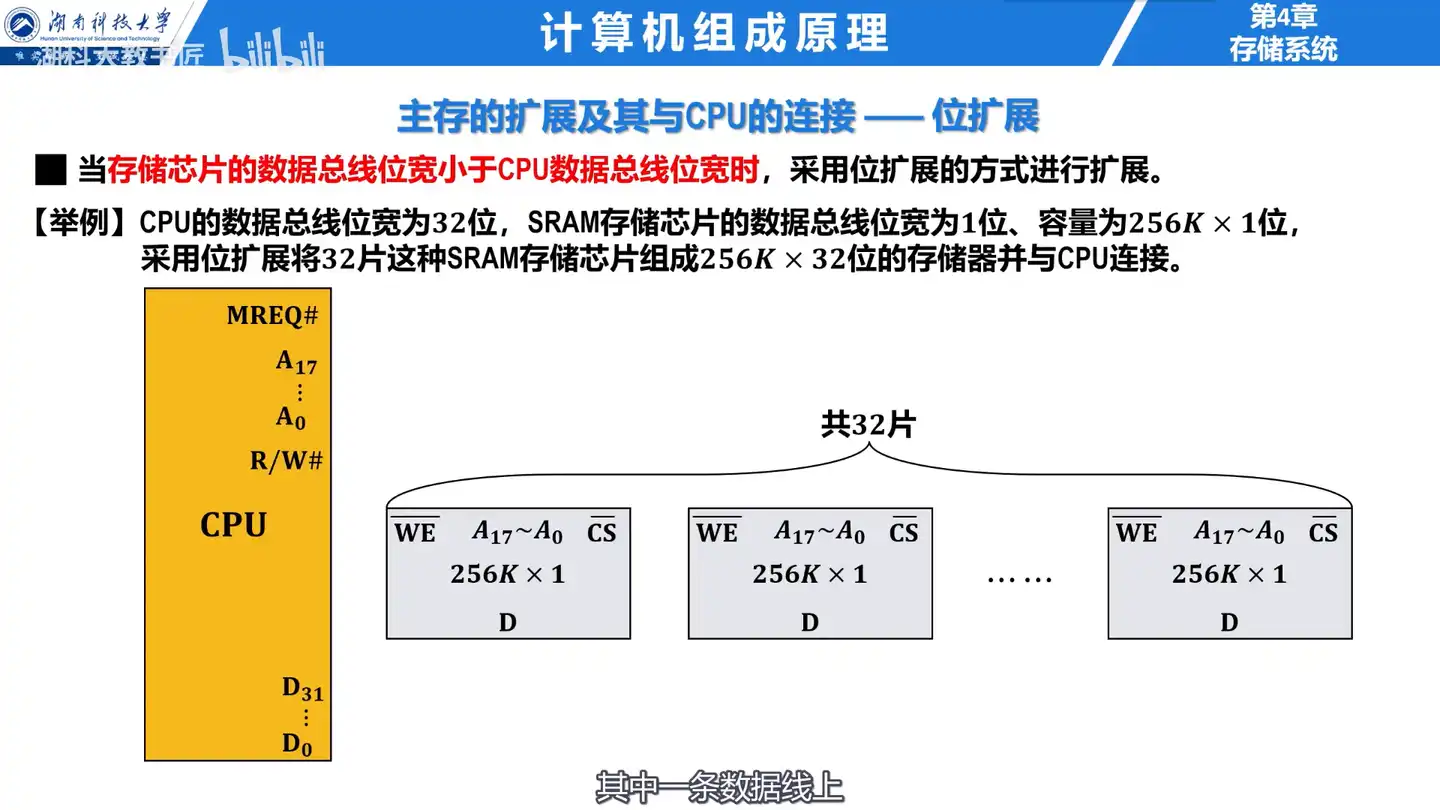 位宽不一致时使用,这里就是32位的地址线,要想每根线都插上东西,但是每个芯片只有一个口给插,所以要32个芯片来让cpu上面的32条数据线可以都插齐(数据线就是下面这个D0到D12)