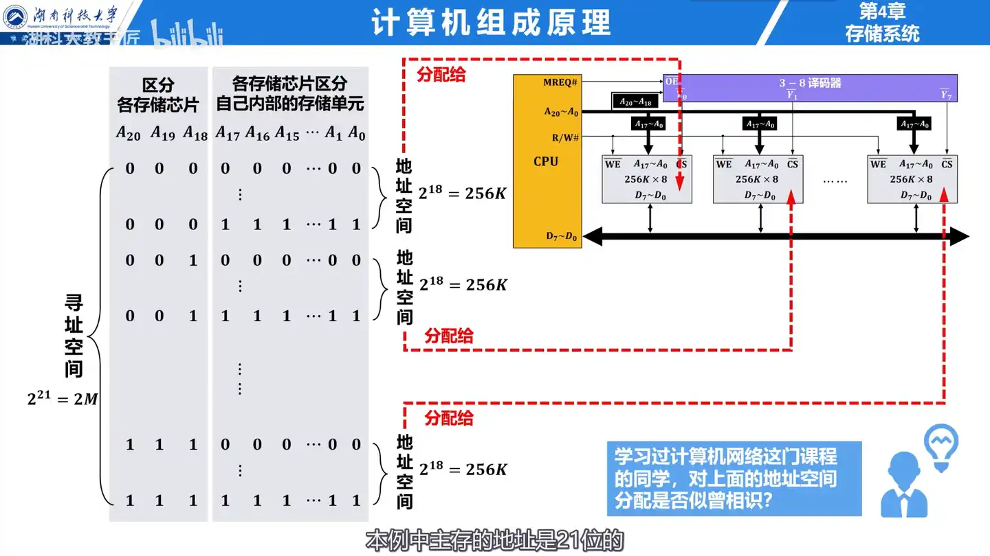 和CIDER非常类似,划分子网的意思,接线口的位宽是对齐的,也就是CPU有21条线远远多余芯片上要插的8条线,但是两者容量不匹配,所以就把cpu多的线拿出来,接入更多的芯片,用多的线作为子网号来控制每次读取写入哪个芯片