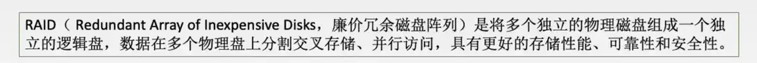 A: RAID 通过将多个独立的物理磁盘组成一个独立的逻辑盘,实现更好的存储性能、可靠性和安全性。