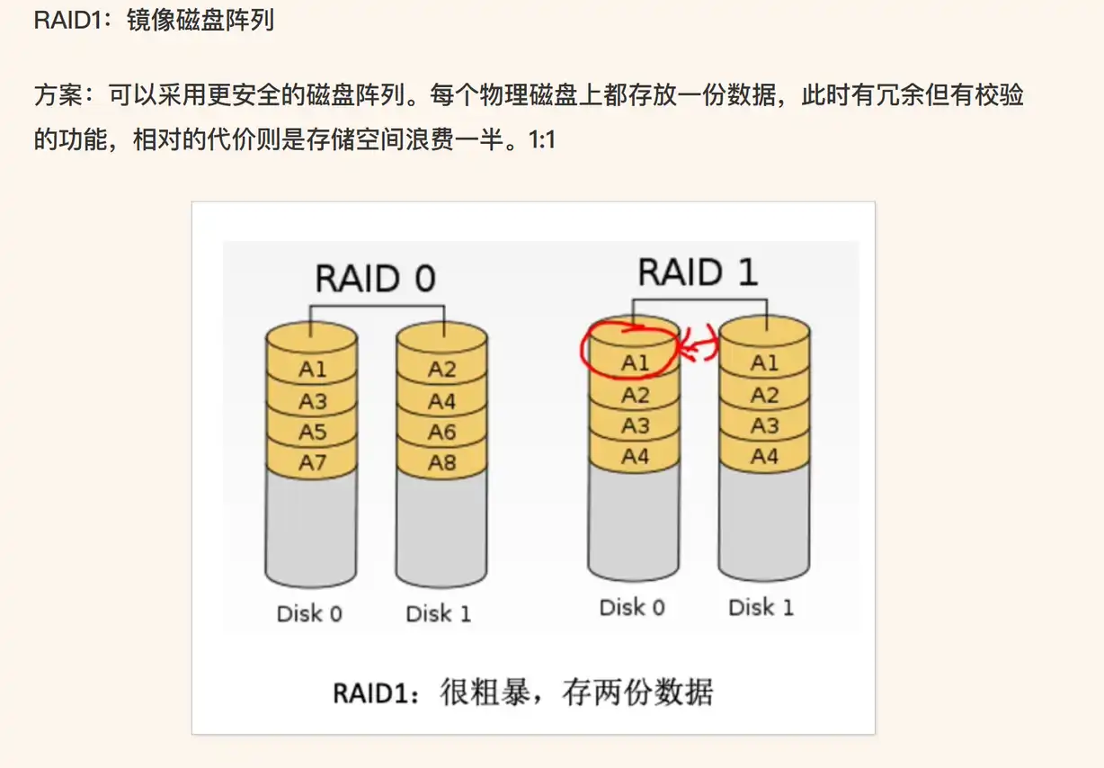 A: RAID1 镜像磁盘阵列,可以提高可靠性,但容量减少一半。