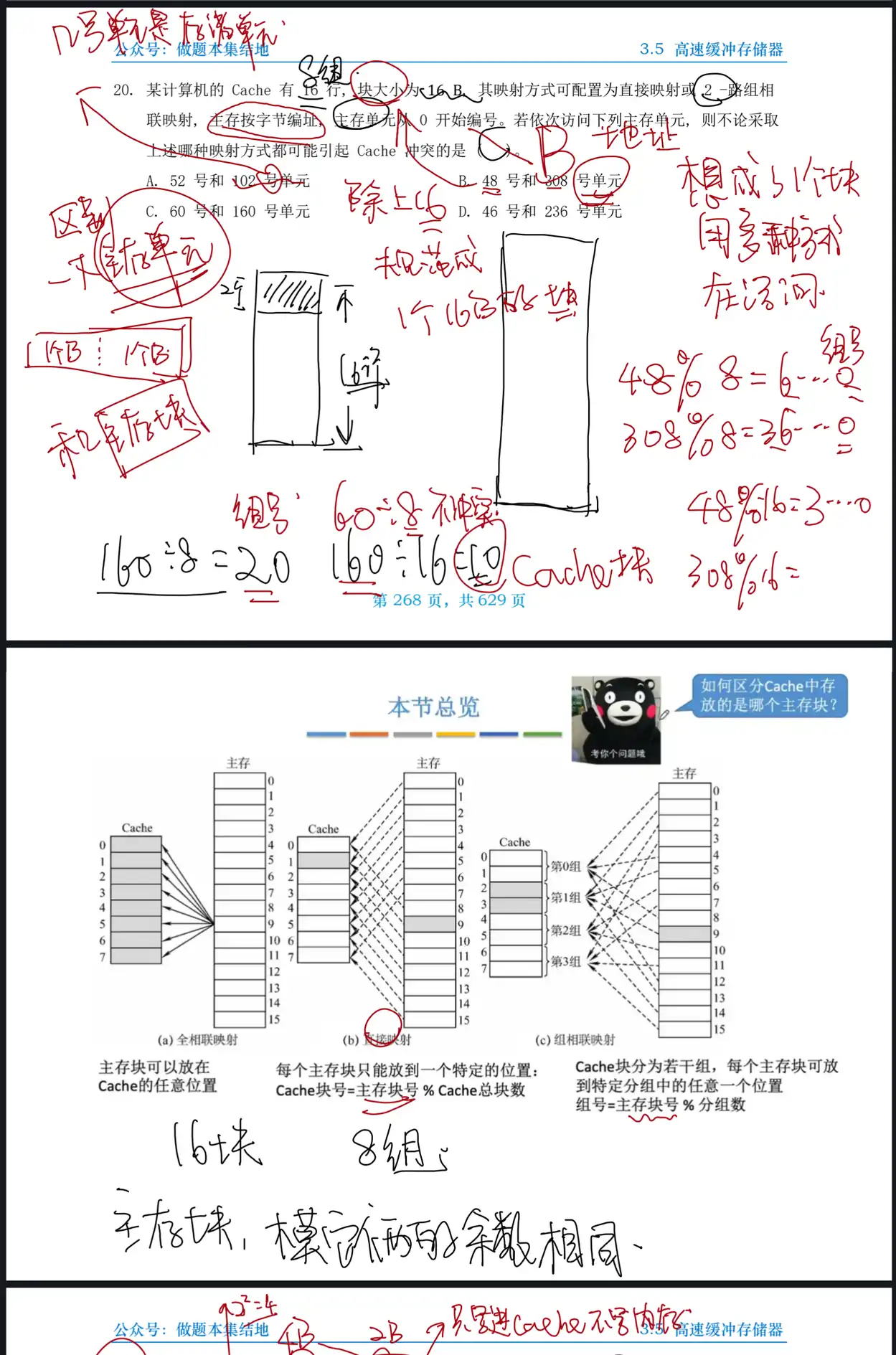块大小为 ,所以块内地址占 4 位。若采用直接映射,Cache 共 16 行,主存地址中块内地址的前 4 位为 Cache 行号,Cache 行号 主存块号 Cache 总行数 , 选项 的地址 48 和 308 的 Cache 行号均为 3,产生冲突。若采用 2-路组相联映射,共有 组,主存地址中块内地址的前 3 位为 Cache 组号,Cache 组号 主存块号%Cache 组数 (主存地址/16)%8, 选项 B 的地址 48 和 308 的 Cache 组号均为 3, 可能产生冲突。