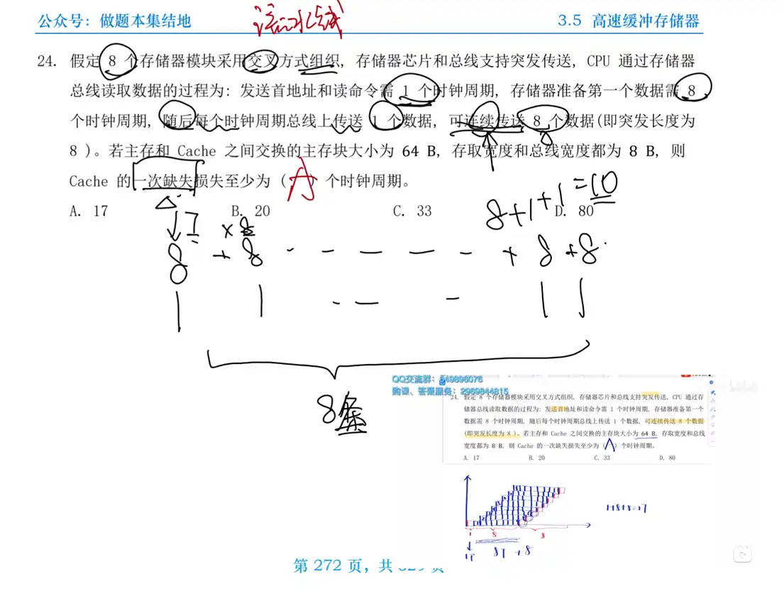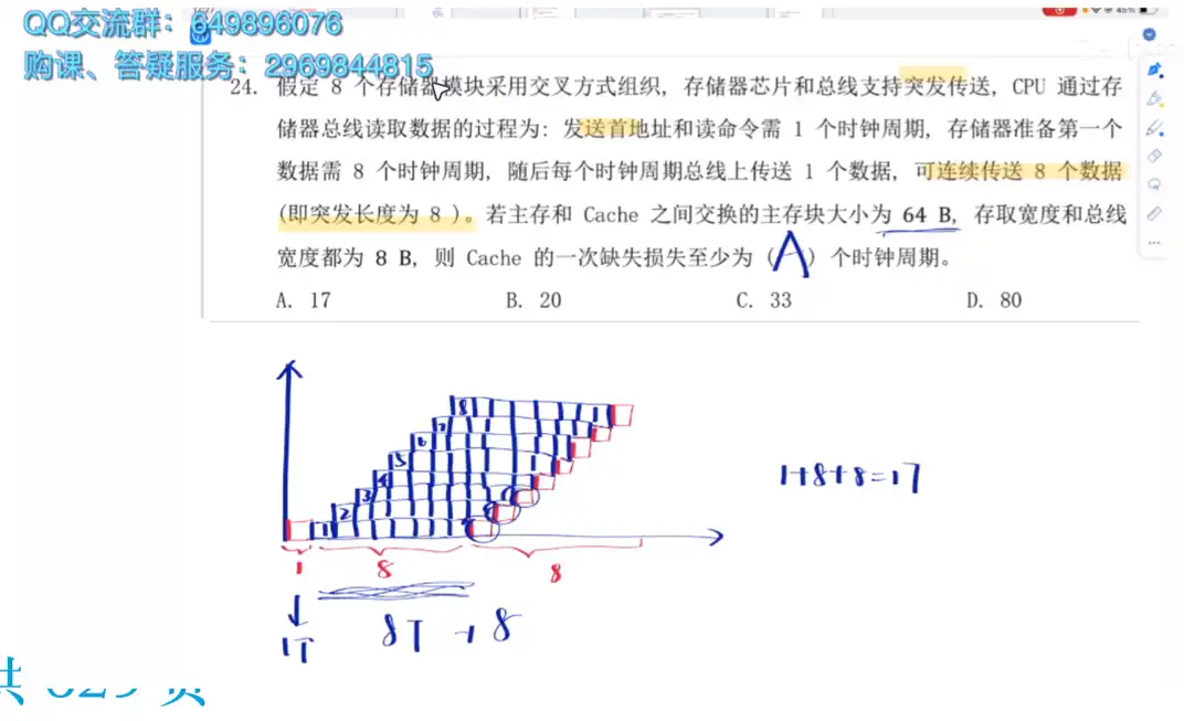Q:假定 8 个存储器模块采用交叉方式组织, 存储器芯片和总线支持突发传送, CPU 通过存储器总线读取数据的过程为: 发送首地址和读命令需 1 个时钟周期, 存储器准备第一个数据需 8 个时钟周期, 随后每个时钟周期总线上传送 1 个数据, 可连续传送 8 个数据 (即突发长度为 8 )。若主存和 Cache 之间交换的主存块大小为 ,存取宽度和总线宽度都为 ,则 Cache 的一次缺失损失至少为 ( ) 个时钟周期。